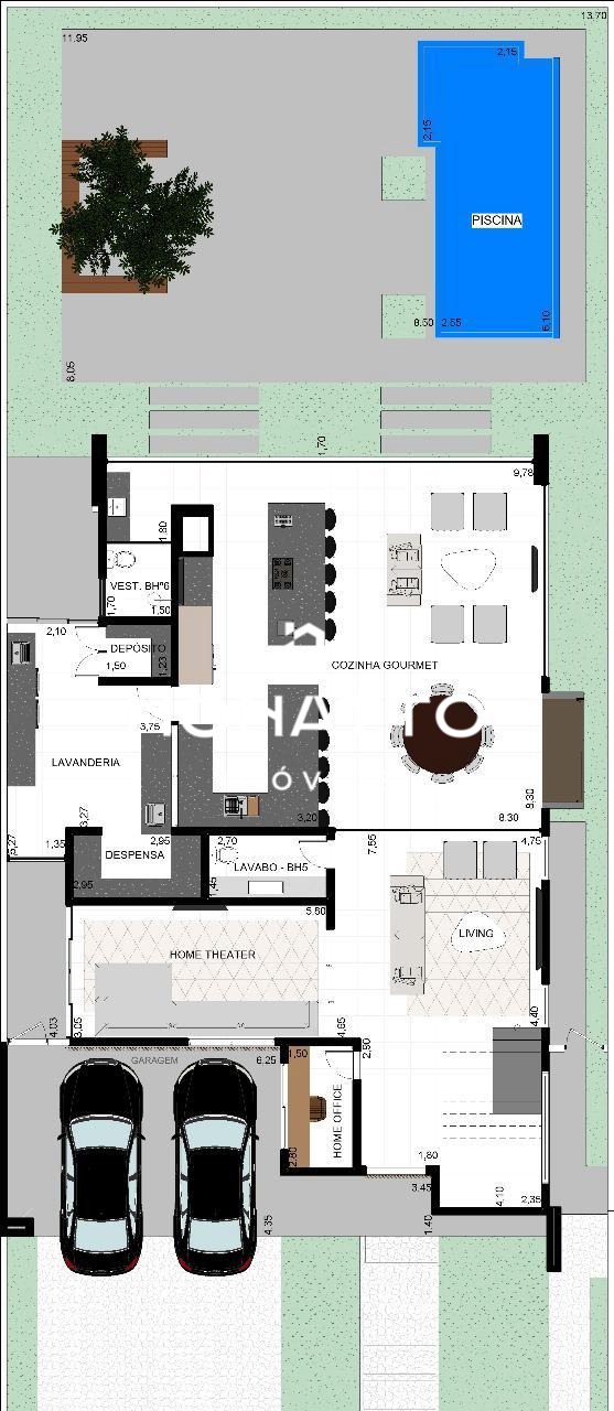 A casa possui 5 suítes sendo 1 no térreo, 2 vagas cobertas, área gourmet, ar condicionado em todos os ambientes, móveis em todos os cômodos, cozinha planejada, escritório, área gourmet, aquecedor solar e área de serviço.